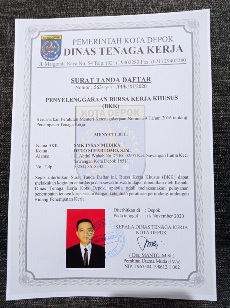 BKK SMK Insan Medika Resmi Memiliki Izin dari Dinas Tenaga Kerja Kota Depok